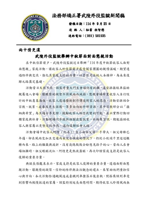 在中秋佳節前夕,武陵外役監獄近日舉辦「114年度中秋節收容人面對面懇親」家庭活動,讓收容人於佳節前夕感受闔家團圓的親情溫暖,期望透過陪伴與交流,強化其家庭支持的力量,以柔性司法的人本精神,為未來復歸之路奠定基礎。